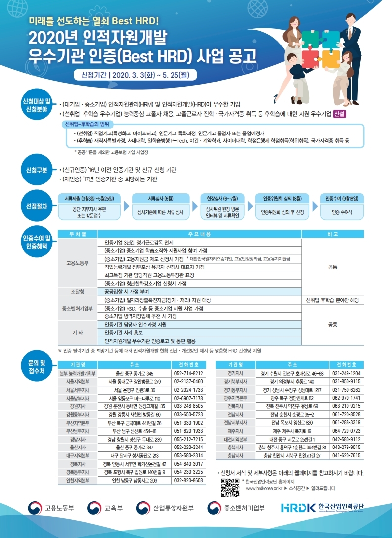 공공 및 민관기관의 인적자원개발 촉진을 목적으로 「2020년 인적자원개발 우수기관 인증(Best HRD) 사업」에 관한 사항을 다음과 같이 공공하오니 희망하는 기관에서는 신청하여 주시기 바랍니다.